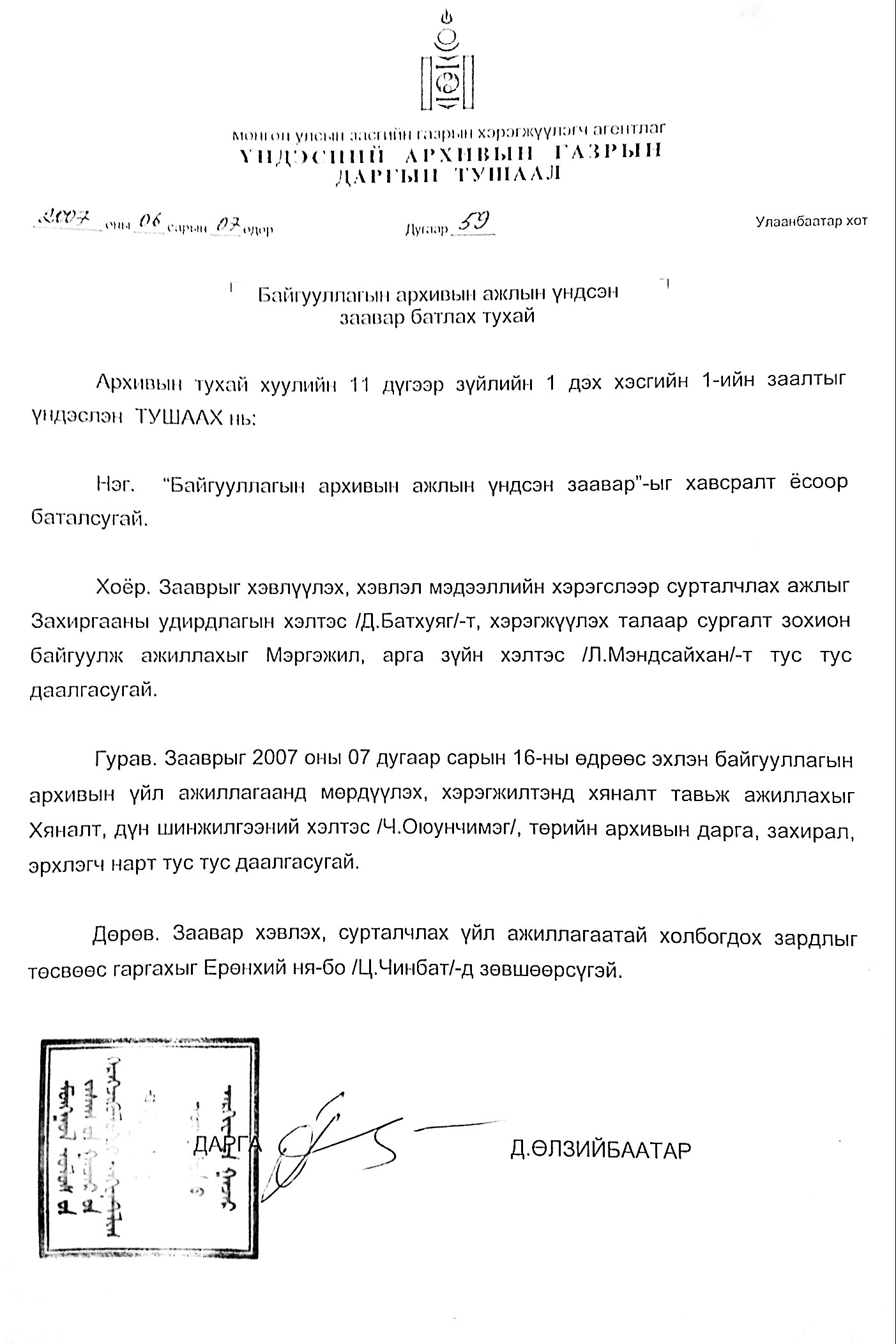 АРХИВЫН ЕРӨНХИЙ ГАЗРЫН ДАРГЫН ТУШААЛ